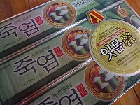 結構手間のかかる製法らしく、竹の中に、全ての毒素をなくす核砒素といわれる成分が含まれている、西海の天然塩(韓国の塩の産地)を詰めて、黄土でフタをして、薪で竹が燃え尽きるまで高温で焼くとか。