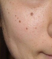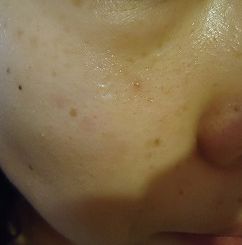 私の場合は、他にもシミやそばかすほくろと点々と小さいのが顔に沢山あるので、写真では分り難いかもしれませんが、その中でも目立って濃い大き目のモノを5つ除去して頂いております。